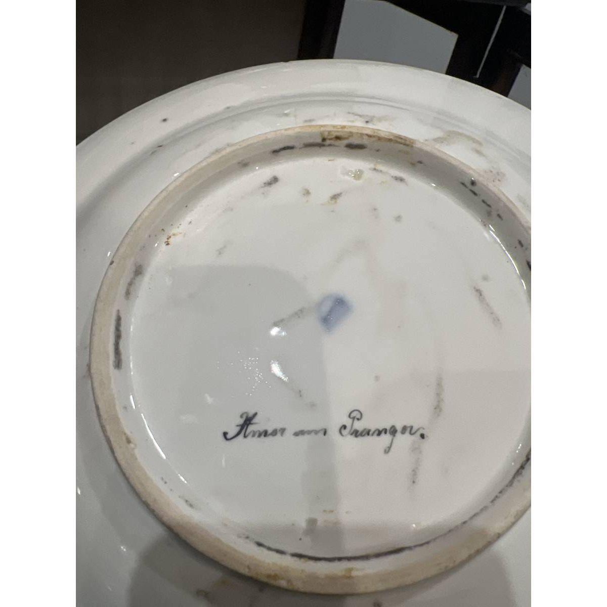 Hand-painted mythological cabinet plate titled ‘Amor am Pranger’ with cobalt and gilt neoclassical border.