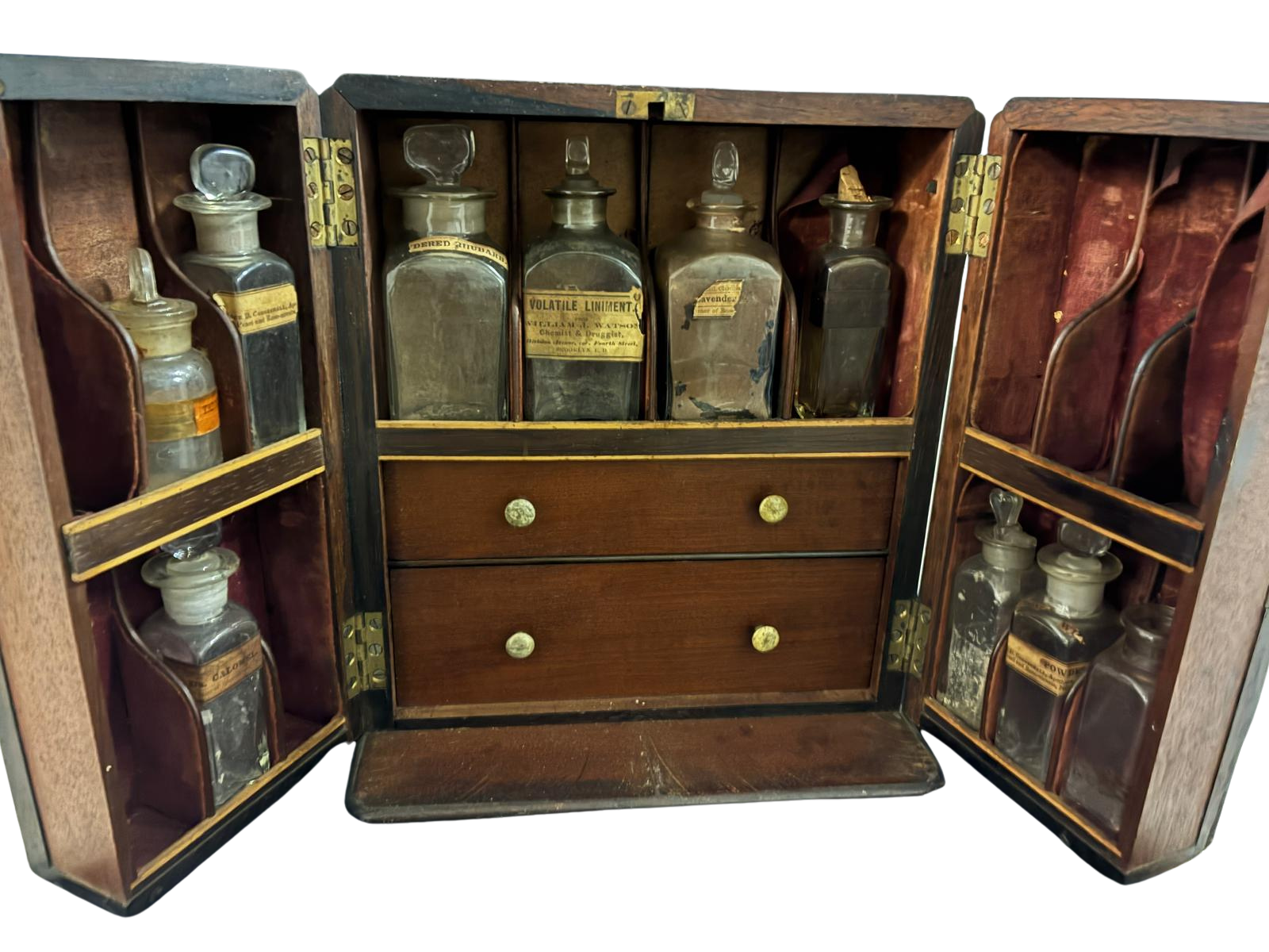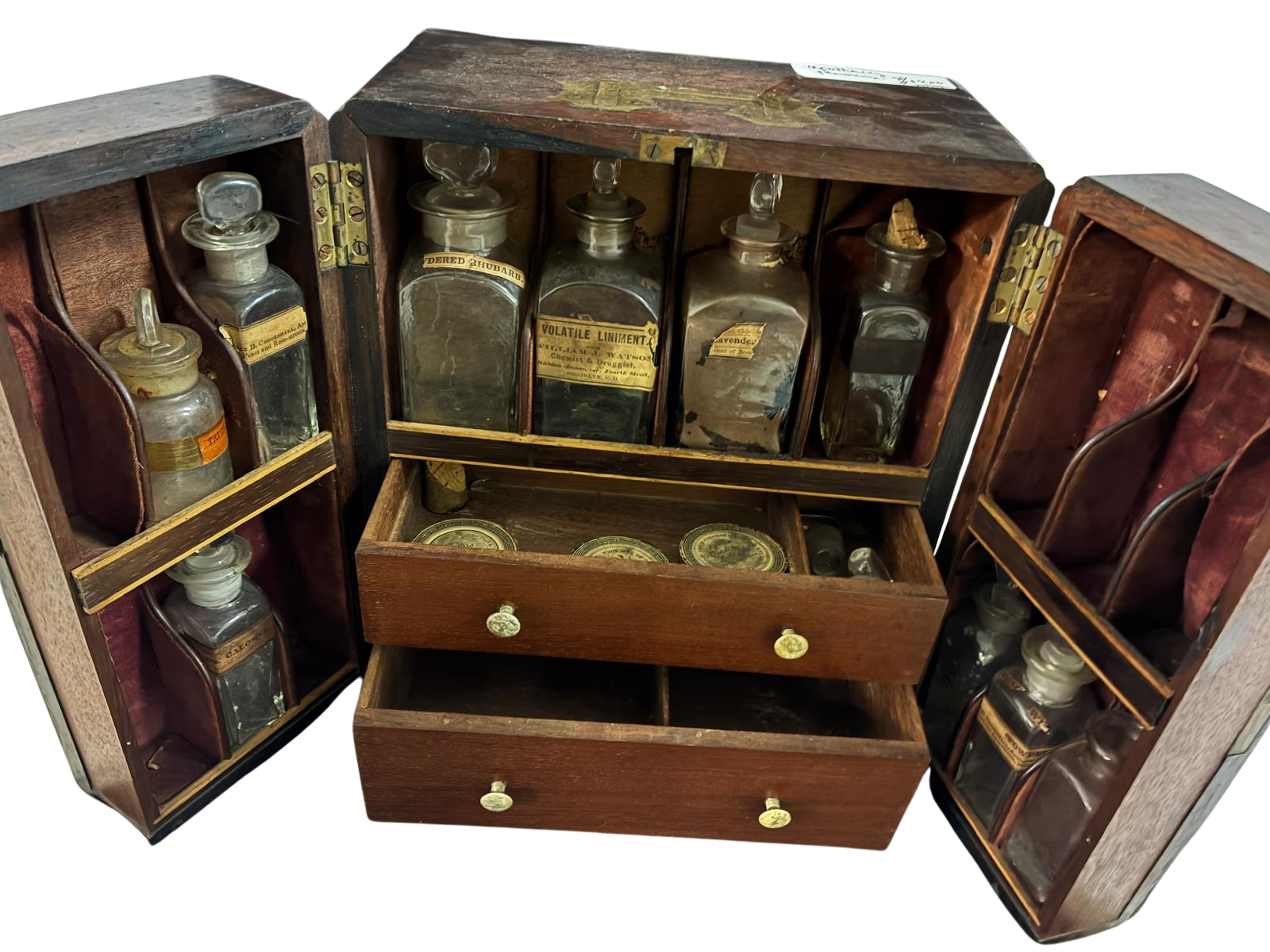 Many of these professional cabinets feature original “Label Under Glass” or bronze fascia plates, often bearing Latin abbreviations for the substances once stored within. The use of mahogany was not only a sign of prestige for the establishment but also served a practical purpose, as the wood is naturally resistant to the spills and varying humidity levels found in an active pharmacy lab. Historically, these pieces stood behind the main counter to impress patrons with the pharmacist’s vast inventory of knowledge and ingredients. Today, such cabinets are highly prized by collectors for their architectural presence and the unique “story” told by the wear and patina on each drawer.