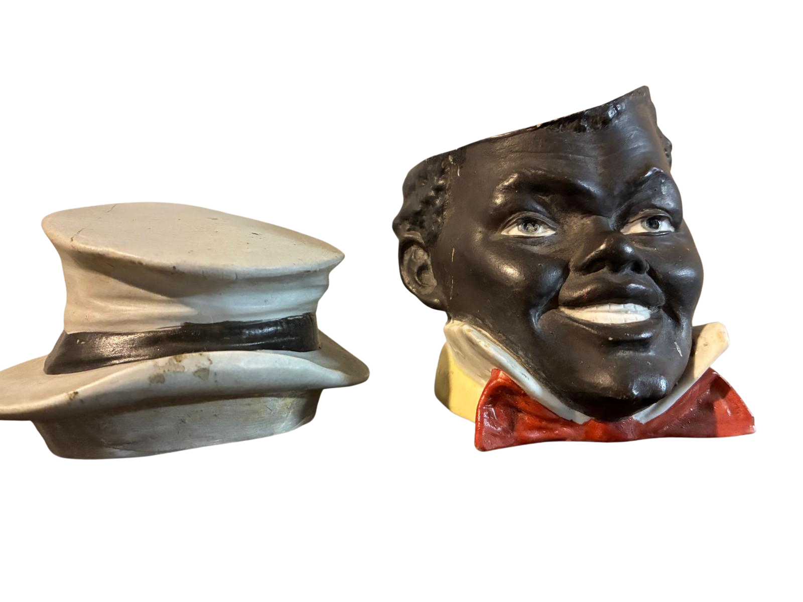 This item is an antique figural tobacco jar (humidor) produced by the prestigious Austrian manufacturer Bernhard Bloch. During the late 19th century, Bloch’s factory in Bohemia (now the Czech Republic) became world-renowned for these “character” humidors, which utilized a meticulous “cold-painted” technique on terra cotta to achieve realistic skin tones and vibrant clothing colors. This specific model depicts a jovial young boy dressed in his “Sunday Finery,” featuring a crisp white collar and a hand-painted red bow tie. The removable lid is expertly modeled as a grey boater-style hat, serving both a decorative and functional purpose by sealing the vessel to keep tobacco moist.