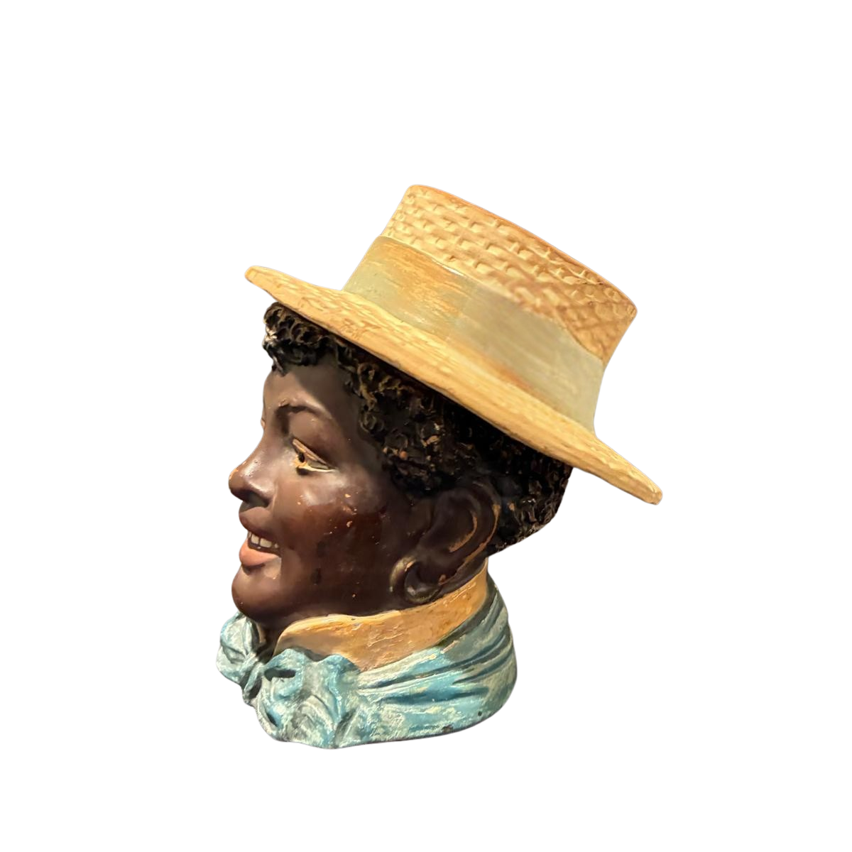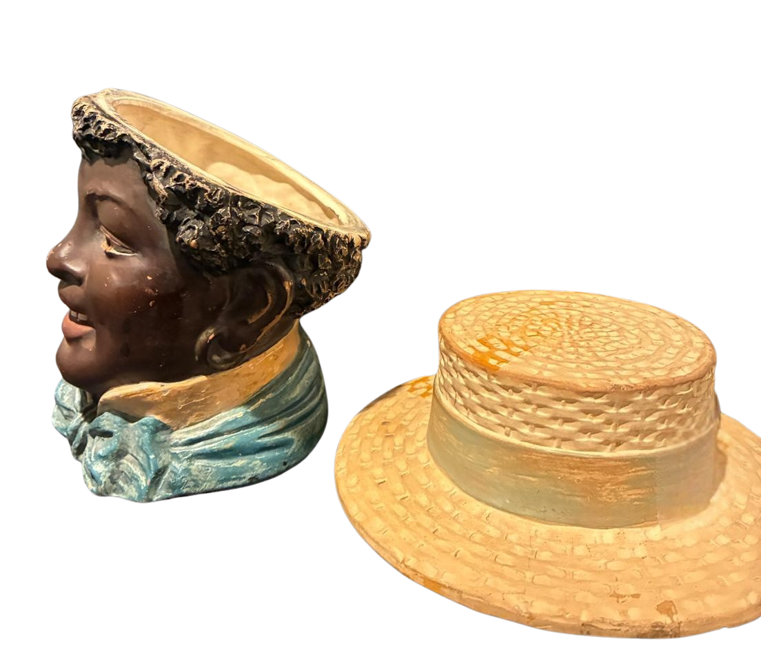 This item is an antique figural tobacco jar (humidor) crafted in the late 19th century by the renowned Austrian ceramic manufacturer Bernhard Bloch (Eichwald, Bohemia). The piece is a two-part ceramic vessel featuring a bust of a smiling young boy wearing “Sunday Finery,” including a white collared shirt and a vibrant light blue bow tie. The removable lid is skillfully modeled as a straw boater hat with a black ribbon band, a design element typical of Bernhard Bloch’s highly collectible figural work from the 1880s and 1890s.