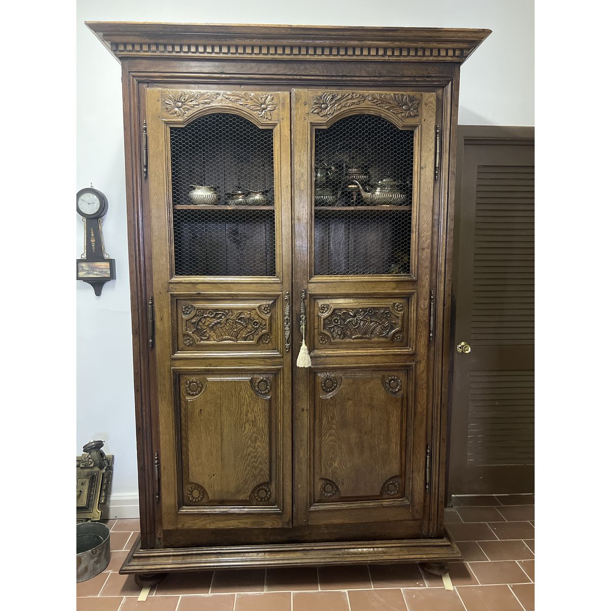 French Provincial Cabinetmaker – c. 1880–1900. Large carved oak provincial cupboard with wire doors and carved panels, ideal as a display cabinet.