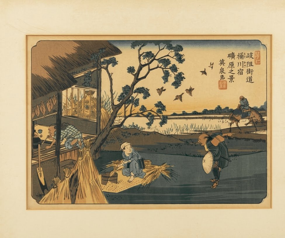 Eisen’s approach to the landscape in this series is characterized by a naturalistic, slightly muted color palette and a keen eye for human activity. The “Open Plain” (Kōgen) of the title is represented by the vast, empty background that recedes into a soft, atmospheric horizon, conveying the quiet solitude of the Kiso Road. As part of one of the most significant landscape series in ukiyo-e history, this work is prized for its balanced composition and its historical documentation of Japan’s traditional travel routes.