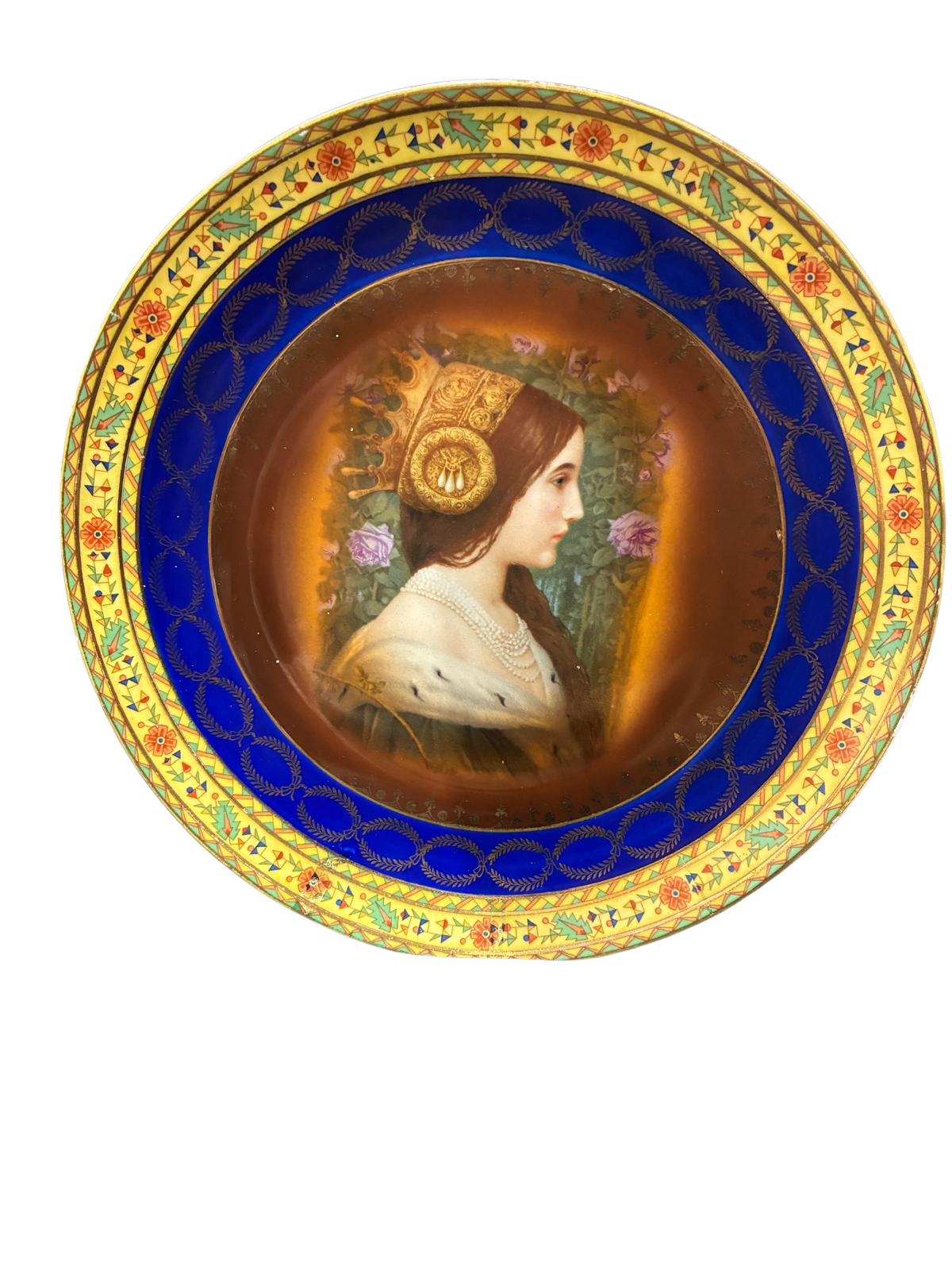 Bohemia Porcelain, Czecho-Slovakia – c. 1920–1935. Royal Vienna–style Bohemian portrait plate with cobalt and gilt border depicting a regal lady in profile.