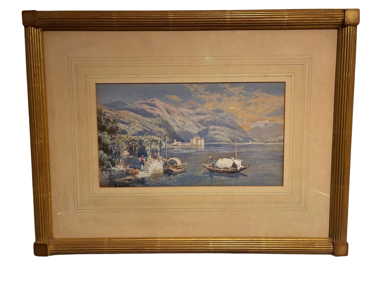This delicate 19th-century watercolour depicts a romanticized view of The Castle of Cannero (Castelli di Cannero) on Lake Maggiore in Northern Italy. The composition is expertly balanced, featuring a sun-drenched shoreline where figures congregate under a lush, vine-covered pergola—a quintessential motif of Victorian-era Italianate landscapes. In the foreground, a traditional barca with a white awning rests on the calm, turquoise water, while the ruined 16th-century fortifications of the Mazzarditi brothers stand prominently on their rocky islets in the middle ground. The hazy, atmospheric treatment of the towering alpine peaks in the distance creates a profound sense of depth and tranquility.The style and subject matter are characteristic of Charles Rowbotham (often misspelled as “Robatham”), a member of a prominent dynasty of English watercolourists who specialized in luminous, detailed views of the Italian lakes and the French Riviera. While your notes suggest a birth date of 1877 and a date of 1979, the painting is firmly a 19th-century work; it is highly likely the date is a typo for 1879, which would place Rowbotham in his early twenties, a period when he began producing these popular “Grand Tour” souvenirs for British travelers. Rowbotham’s mastery of the medium is evident in his ability to capture the specific quality of Mediterranean light and the intricate textures of the weathered stone quay and distant ruins.